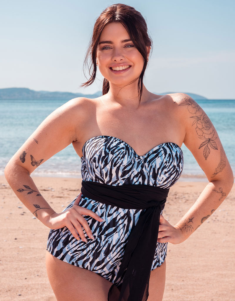 Curvy Kate's Wrapsody strapless bandeau swimsuit is back in a bold zebra print, perfect for any sunny destination! Wrap it, twist it, tie it and bow it your way with the quick-dry mesh panels, designed to give you an endless array of different looks in one piece.