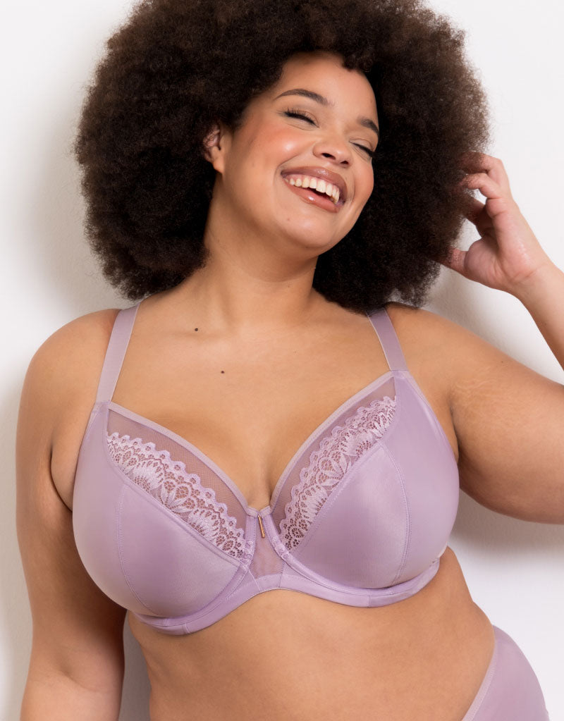 Adella's Hera full plunge bra is here in a soft lavender hue, available up to a K cup in sleek fabrics. This fuller coverage plunge style provides a lower neckline without compromising coverage or support.