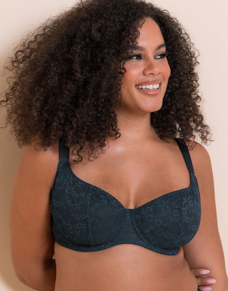 Curvy Kate's All Night Lace range brings a scooped balcony bra shape to the table in a deep denim blue, made from delicate stretch lace giving it a comfortable, adaptable fit.
