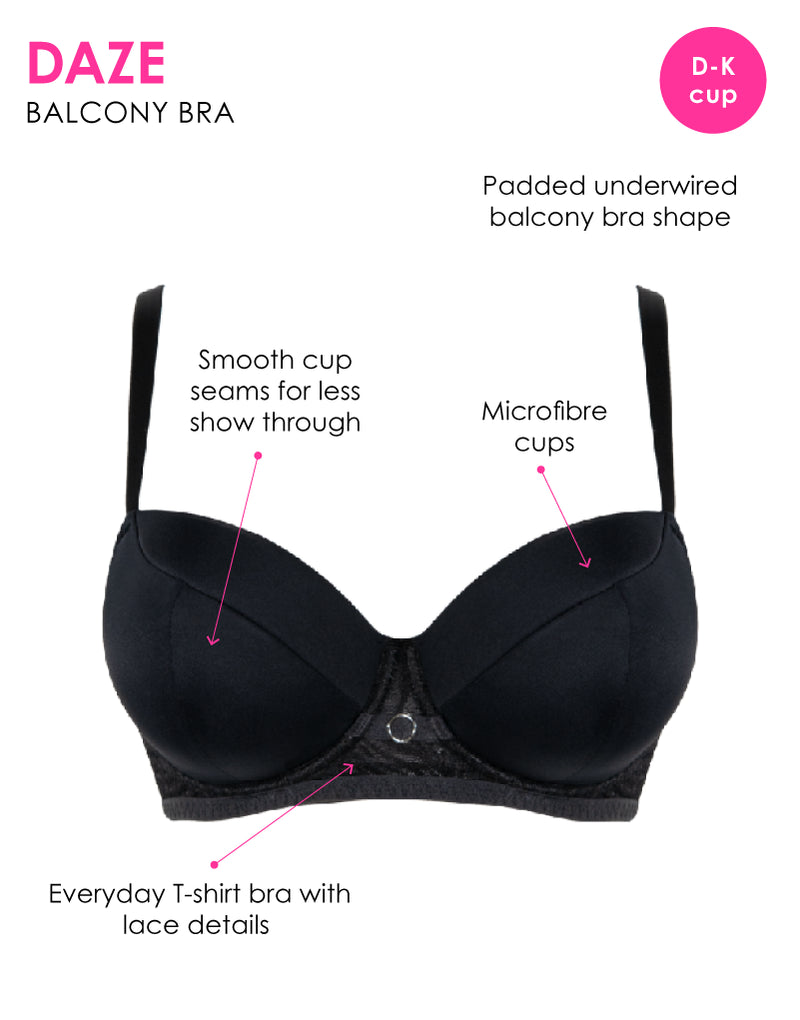 Welcome the latest addition to the Curvy Kate Lace Daze range, the foam lined Daze t-shirt balcony bra in black! This effortless and easy to wear style will be a new go-to, with its soft foam lined cups and flat seams in buttery smooth microfibre to give a sleek fit under clothes, trimmed with the same zebra effect lace for a pretty finish around the underband. Offering a rounded and uplifted shape up to a K cup!