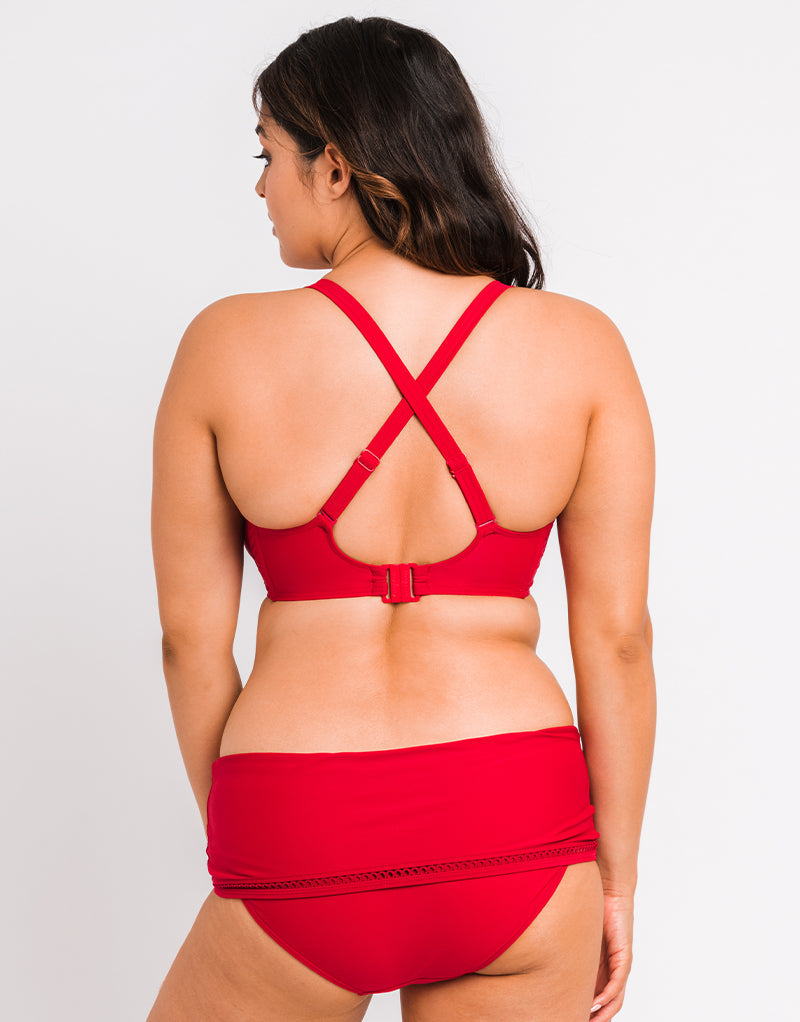 Level up your swimwear with the Curvy Kate First Class balcony bikini in red! This simple but chic design is made using 35% recycled nylon fabrics and features a lower scooped neckline to really show off your curves. Multi-way straps that can be worn classic over the shoulder, cross back or tied into a halterneck, finished with a sweet criss-cross trim to the neck edge to enhance the cut.