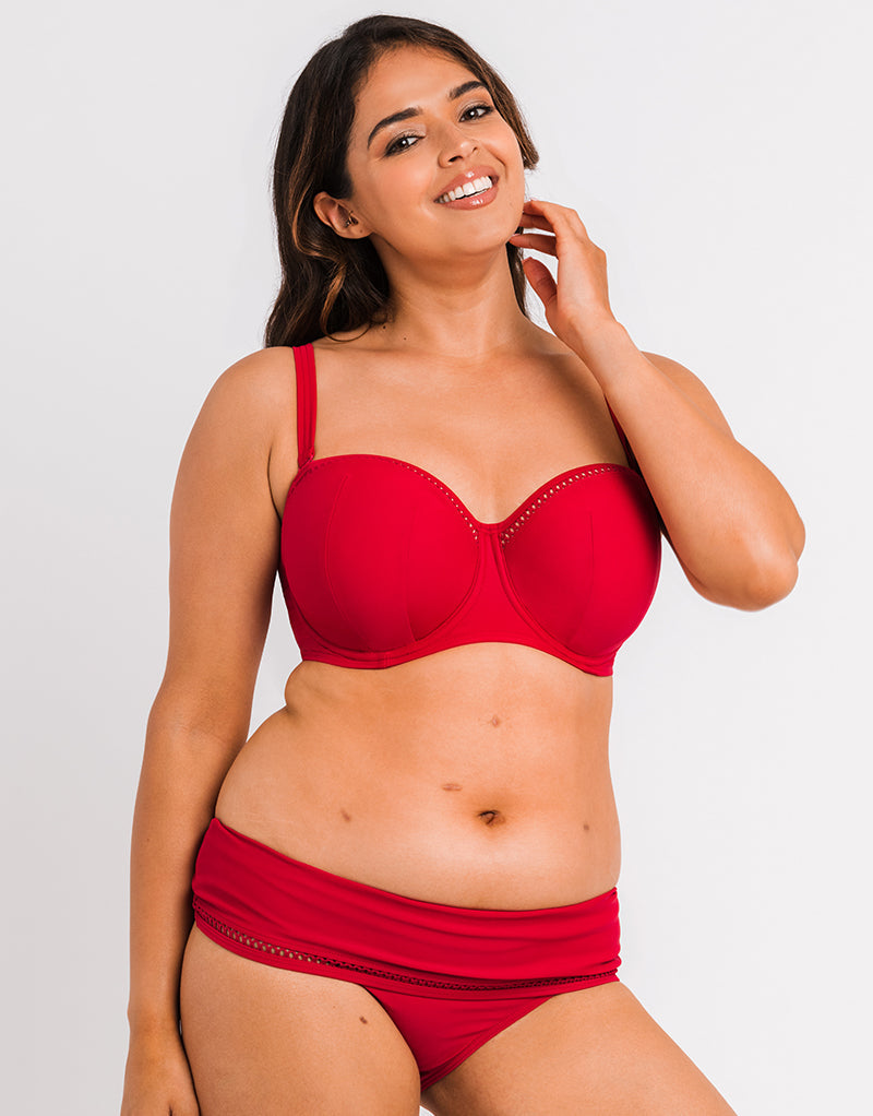 The First Class deep fold over brief from Curvy Kate is stunning in a bold red, and made with 45% recycled materials. A classic bikini shape meets a thick waistband that can be worn as high or low on the hips as you like, complete with a criss-cross insert trim to match the rest of the collection.
