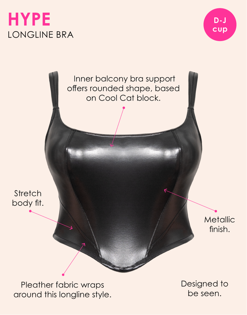 Turn up the drama! The Hype longline corset balcony bra from Curvy Kate is sleek and bold in a metallic gunmetal grey. Made to stand-out, this pleather bra has a stretch body fit for total comfort with an inner balcony bra that supports and shapes D+ cups - letting those of us with fuller busts embrace the latest trends too! Perfect for pairing with your fave jeans, shorts or skirt for a striking outerwear look.