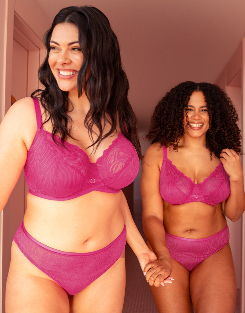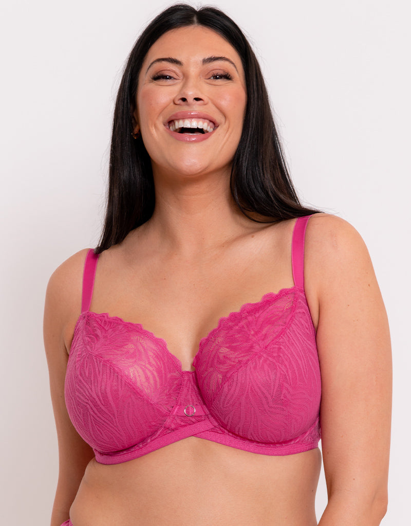 Curvy Kate's Lace Daze balcony bra oozes femininity in this bold lipstick pink with zebra effect lace, perfect for adding a pop of colour to your top drawer! The balcony cups have a 3-part shape with stretch lace to the top cup to ensure a flexible, comfortable fit that moves with your bust and accommodates monthly size and fullness fluctuations as well as providing a great fit for those with asymmetrical breasts. Upfront Technology gives your bust a forward, uplifted shape, along with a curved cross-over centre front for upper tummy comfort.