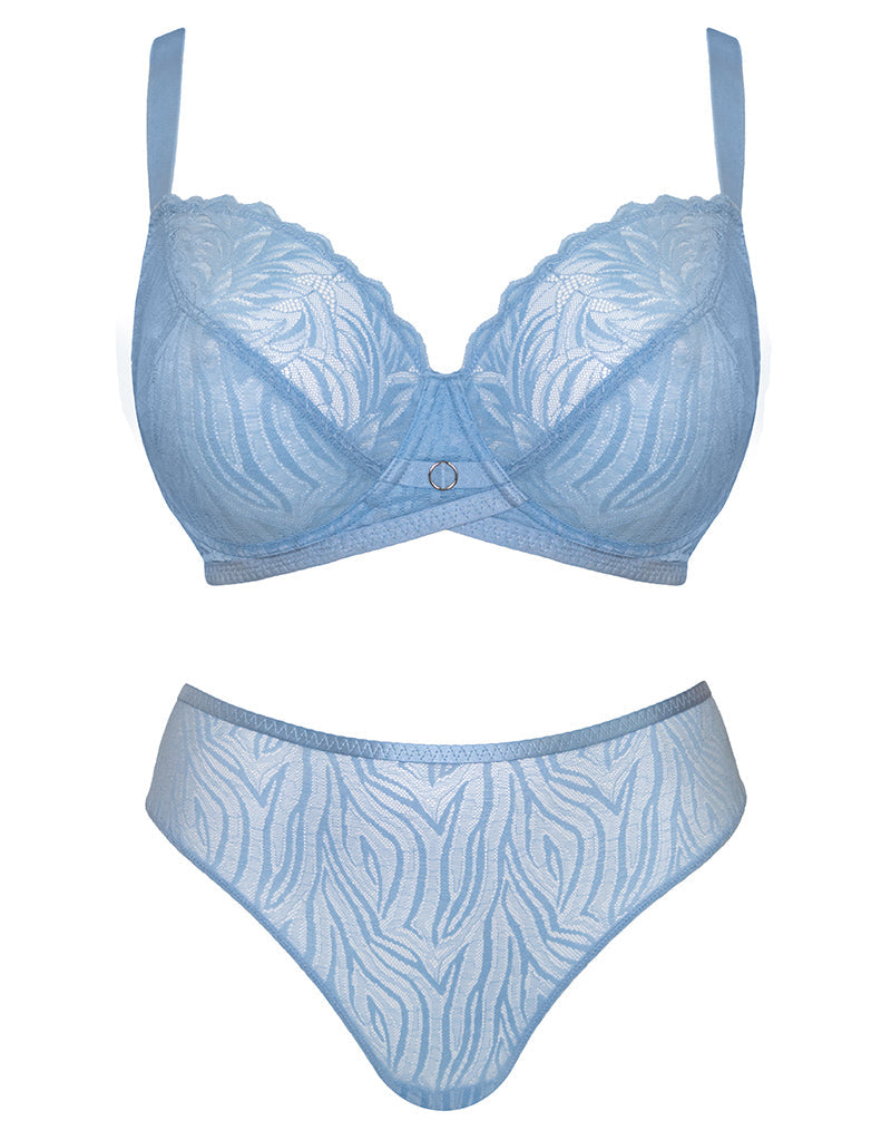 Curvy Kate's Lace Daze balcony bra is oh-so-sassy in zebra effect lace, and now in a pretty powder blue colour. 3-part balcony cups with stretch lace to the top ensures a flexible, comfortable fit that moves with your bust, and accommodates monthly size and fullness fluctuations and asymmetrical breasts. Upfront Technology gives your bust a forward, uplifted shape, along with a curved cross-over centre front for upper tummy comfort.