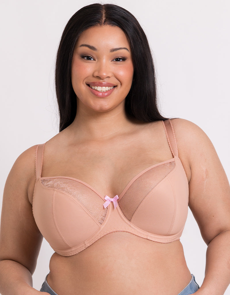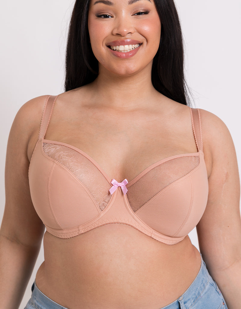 Curvy Kate's Moody Bloom balcony bra in latte is your perfect everyday essential. 3-part cups with laminated bottom sections offer uplift and projection through to a K cup, with a lighter lace top cup to keep it pretty. Complete with fully adjustable shoulder straps and a powermesh band to ensure a comfortable fit all day long.