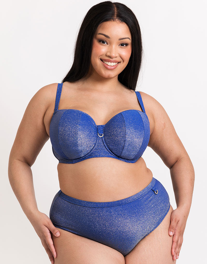 Curvy Kate's Sapphire Seas range is complete with the matching high waist bikini brief. This shimmery, sparkly swim bottom offers a higher rise and a comfortable fit with glamorous style. Containing recycled fibre content and finished with a gold D-ring charm at the hip.
