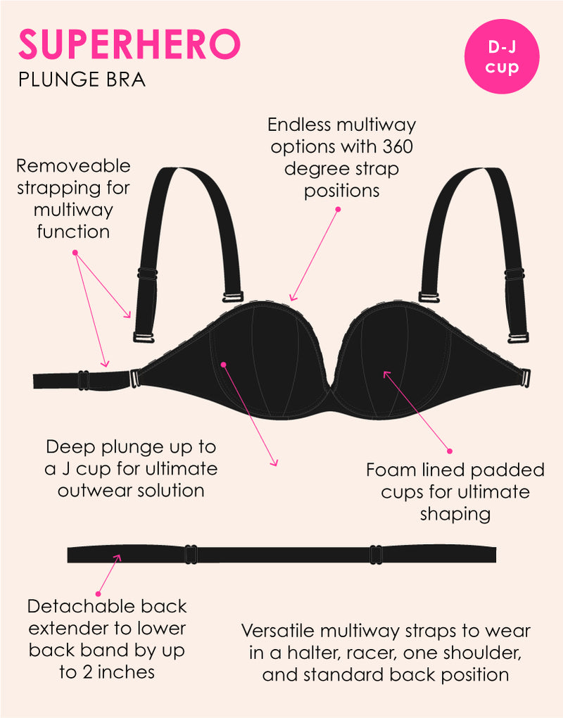 You asked, they listened - Curvy Kate's game-changing Superhero multiway padded plunge bra is now available in Black! Lightly foam lined cups and supportive underwire meet an ultra-low plunge neckline, making Superhero your ultimate solutions bra offering over 100 ways to wear with completely removable, fully adjustable straps.