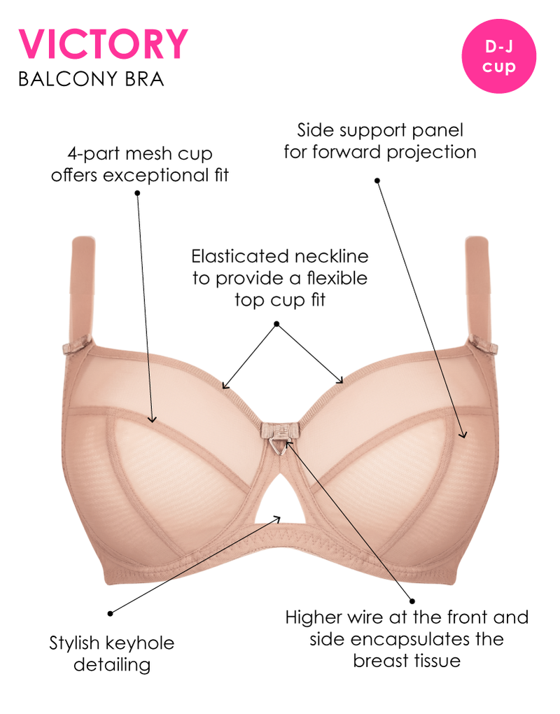 The Curvy Kate Victory balcony bra in Latte is what dreams are made of. With a sturdy four part mesh cup, your bust will be pulled in from the sides to create a naturally rounded shape with maximum support. On-trend cutout detail to the centre gore is finished off with simple silver hardware.