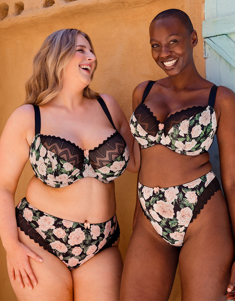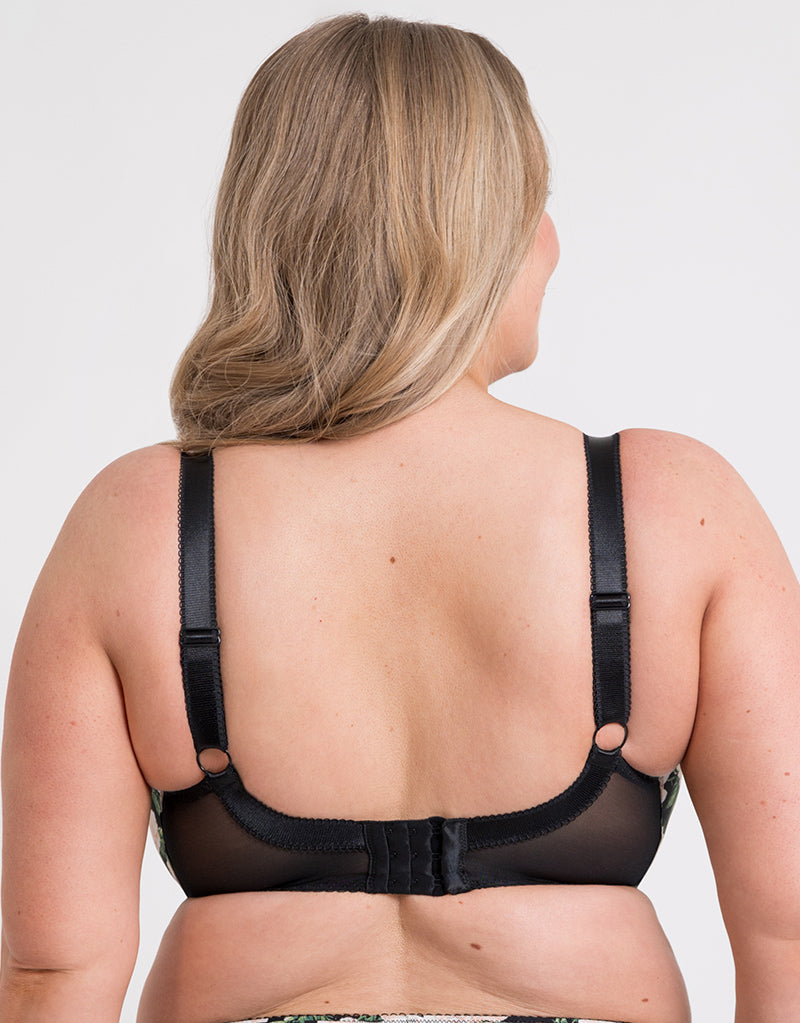 Wild One is back! This Curvy Kate balcony style returns in a beautiful floral print on a black base, featuring a geometric stretch lace top cup detail which offers a flexible fit that moves with your curves, accommodating for breast fluctuations and asymmetry. The simplex bottom cups are opaque for modesty and everyday wear, ensuring a great fit with fantastic support and shape, and giving an up-front look for the perfect foundation to your outfit.