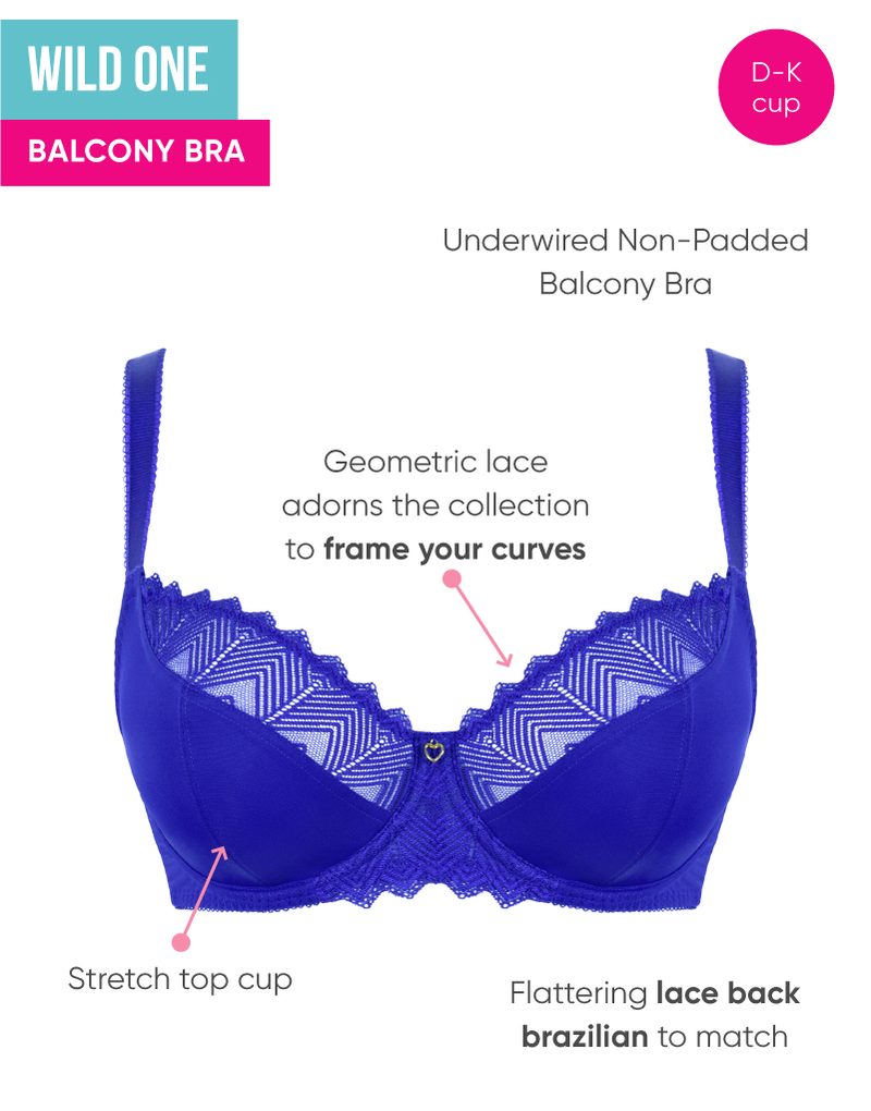The Curvy Kate Wild One balcony bra returns in a striking ultraviolet blue! A geometric stretch lace top cup detail not only looks great, but offers a flexible fit that moves with your curves and accommodates for breast fluctuations and asymmetry. Simplex bottom cups are opaque for modesty and everyday wear, offering great fit with fantastic support and shape, giving an up-front look for the perfect foundation to your outfit.