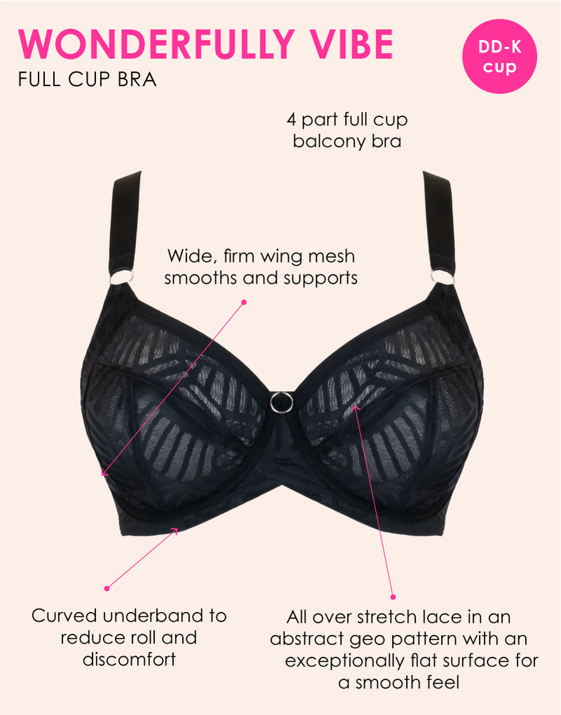 Curvy Kate's WonderFull Vibe is here to level up your LBB (Little Black Bra)! This all-over stretch lace style offers a super comfortable fit that moves with your curves, designed with an abstract geometric lace design that's exceptionally flat for a smooth, sleek shape under clothes. 4-part cups with side panels give great shape, with a curved centre front to reduce band roll and discomfort. Finished with a deeper side wing made from a firm mesh to smooth and support.