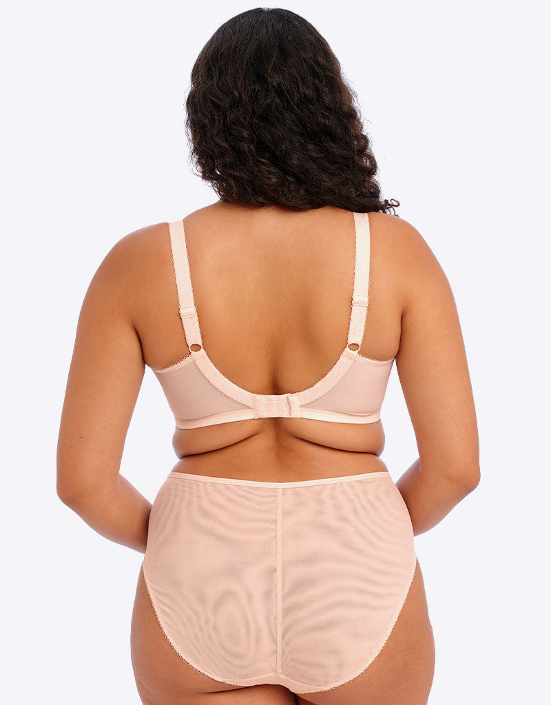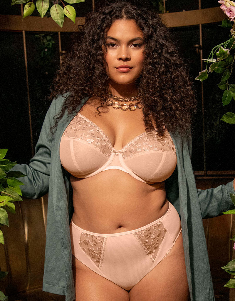 Elomi's Namrah plunge bra is perfect for everyday in a pale blush pink. The bandless design offers total comfort especially for those with shorter torsos, while the frame is based on the brand's bestselling Matilda bra which offers a low plunge cut without compromising on support, fit or hold. Side panels give great shape with a sassy leopard print embroidery across the top cup to finish it off in style.
