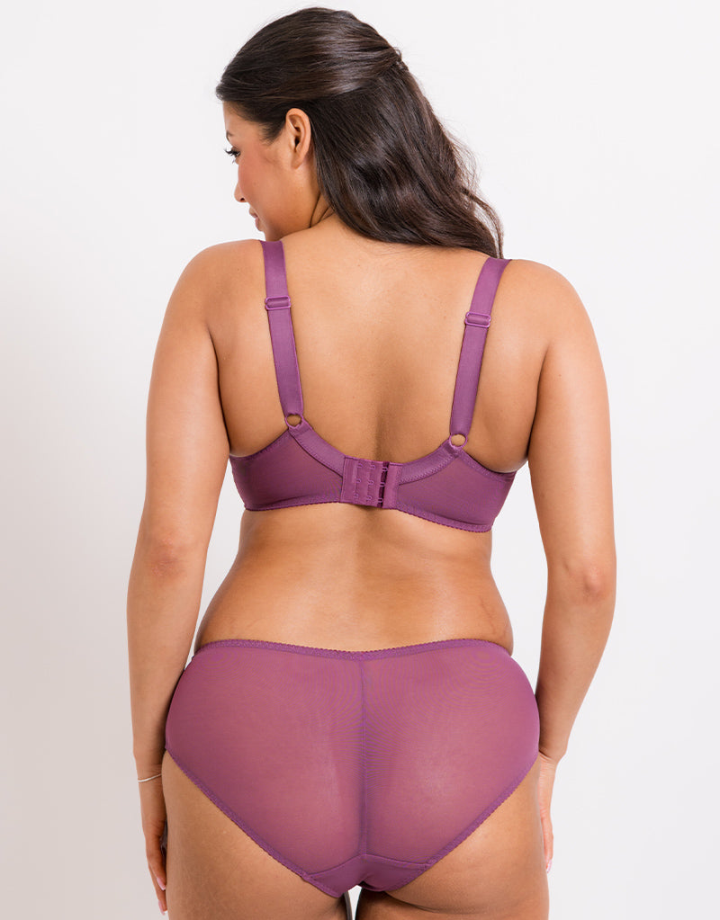 Flirtelle's bestselling Alice bra is back in a beautiful purple combo, with a mauve base and contrast darker plum embroider. Constructed with a supportive 3-piece balcony cup, it uses an extra layer of mesh in the bottom cups to add extra uplift with a projected shape. Wide, non-slip 22mm wide shoulder straps ensure all-day, everyday comfort combined with a powermesh underband.