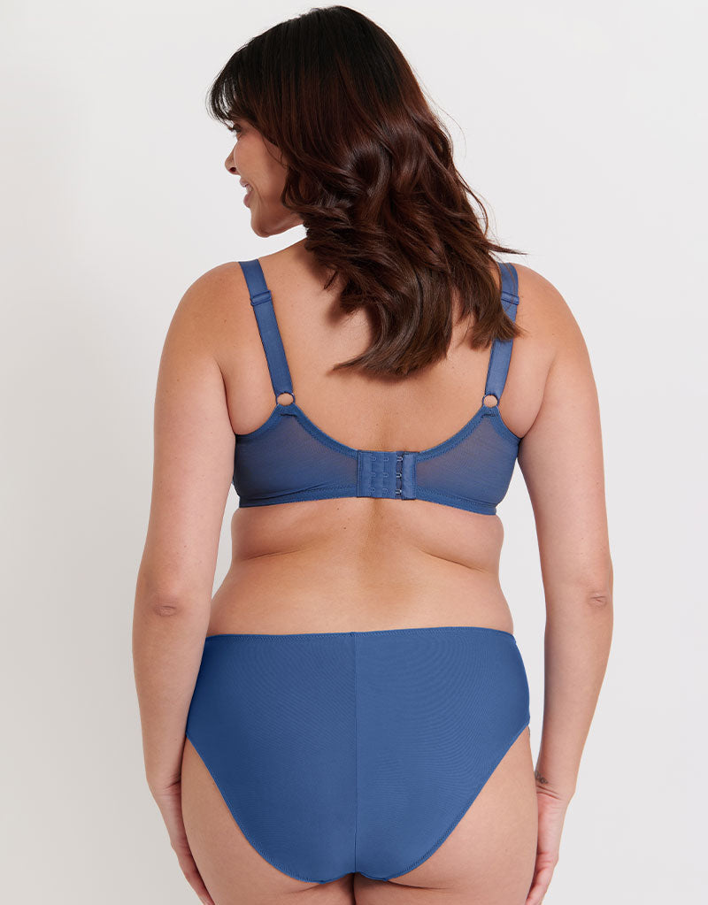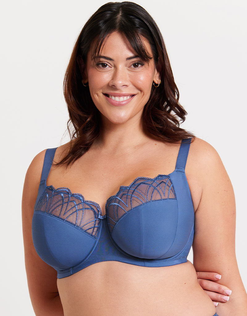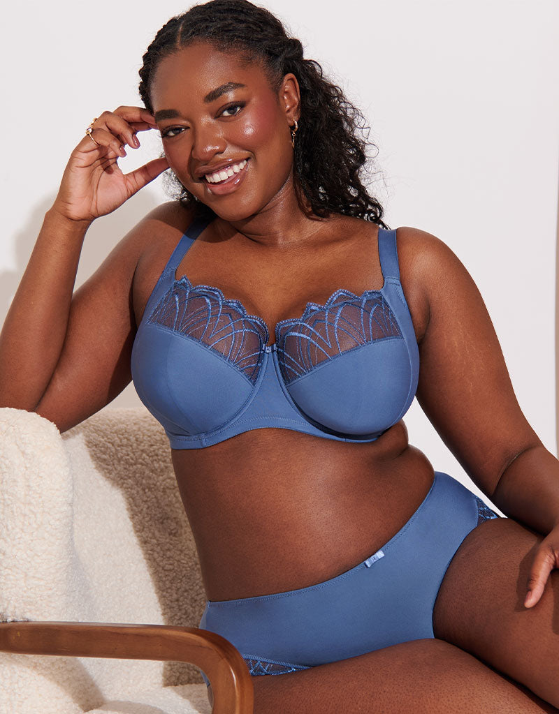 Ooh-la-la! Say bonjour to Flirtelle's Emilie Deco full cup side support bra in French Blue. This is an Art Deco inspired take on our bestselling Flirtelle Emilie full cup bra with a new statement top cup embroidery.