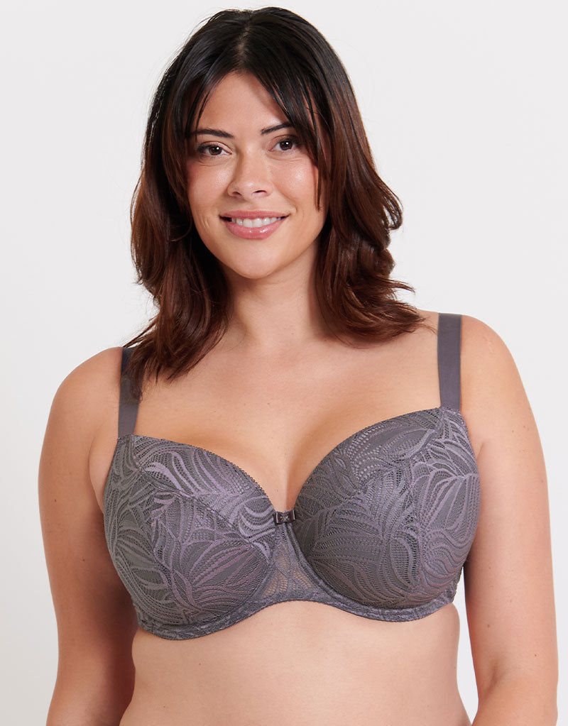 Our Flirtelle Isla padded balcony bra is back in a cool Twilight Grey. If you love Flirtelle Esme, you'll love this new fresh take on the style. Foam lined cups give a structured fit and feel with an uplifted, rounded shape that doesn't add extra bulk to your bust. Styled with a feminine, leaf-inspired zigzag mesh overlay to elevate the appearance.