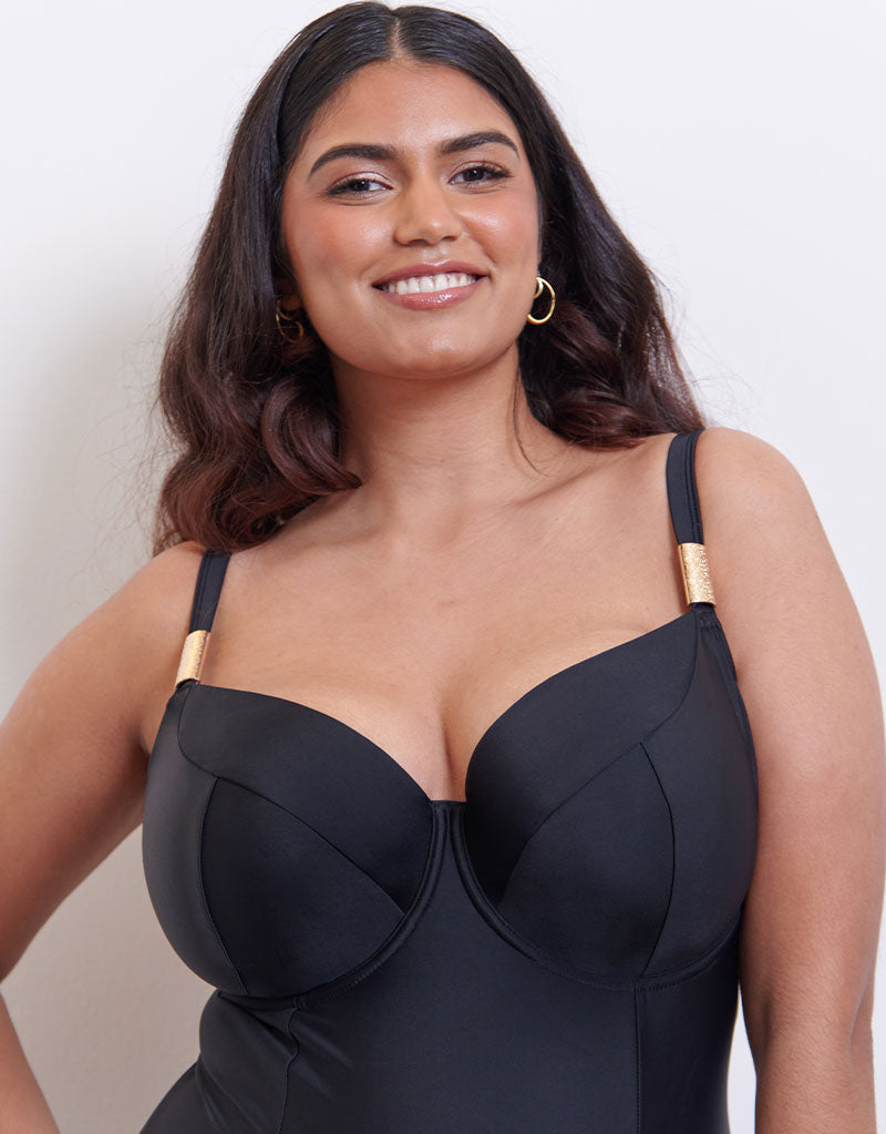 Flirtelle's Maya Bay swimsuit will be your new LBS (Little Black Swimsuit) in this classic, all-black design with metallic detail to the straps. Non-padded, balcony cups are underwired to give perfect support, with a mesh lining to maintain their shape even in the water. Comfortable and flattering with a classic brief coverage to the rear, so you can enjoy your holiday in style and security!