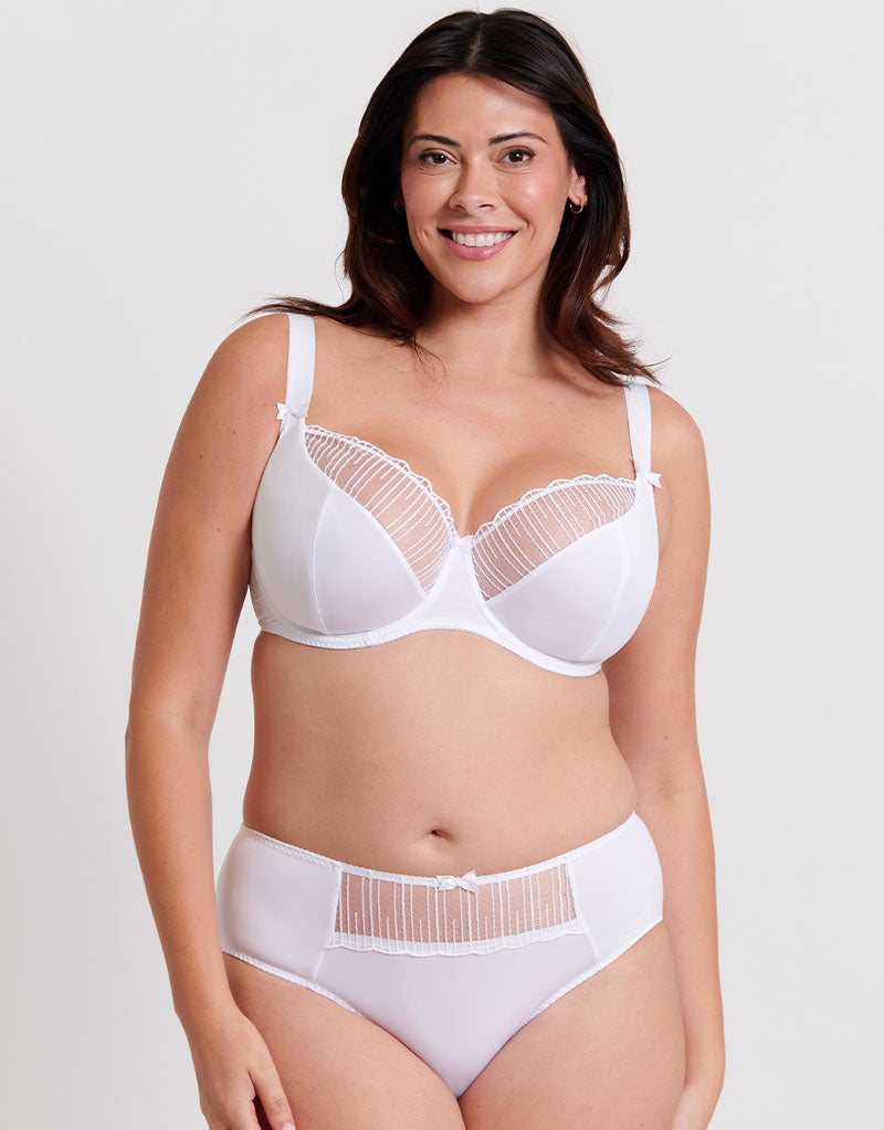 Make it a match everyday with the Flirtelle Riley brief in white. This classic knicker offers comfort and coverage with soft microfibre fabrics, featuring elasticated edges with a full bottom cut. Finished with an embroidered front panel to match back to the bra.