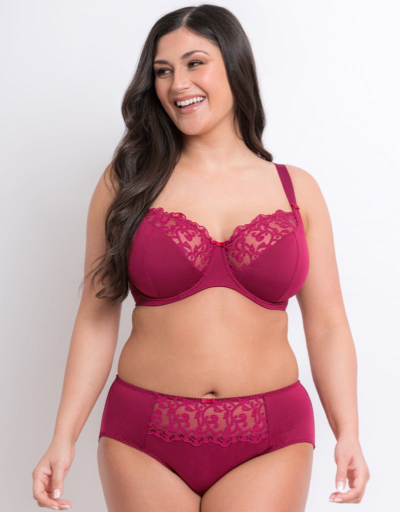 Flirtelle's Swirl balcony bra is gorgeous in a rich sangria hue. The smooth microfibre outer fabric is opaque for a perfect everyday style, with intricate swirled top cup embroidery to keep it pretty. Wide, non-slip shoulder straps and non-stretch mesh lining in the cups keep it secure and uplifting in F-K cups.