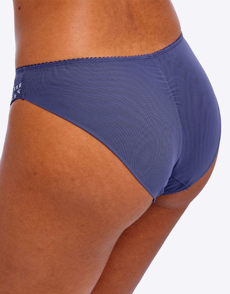 Complete your look with Freya's Loveland brief in Boudoir Dusk. A classic knicker made from soft mesh, offering a comfortable everyday fit in a muted denim blue shade. Offering moderate coverage with folded rear leg edging to sit smoothly under clothes.