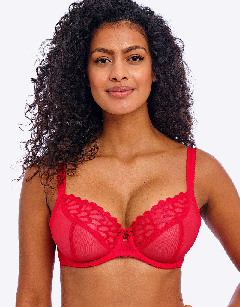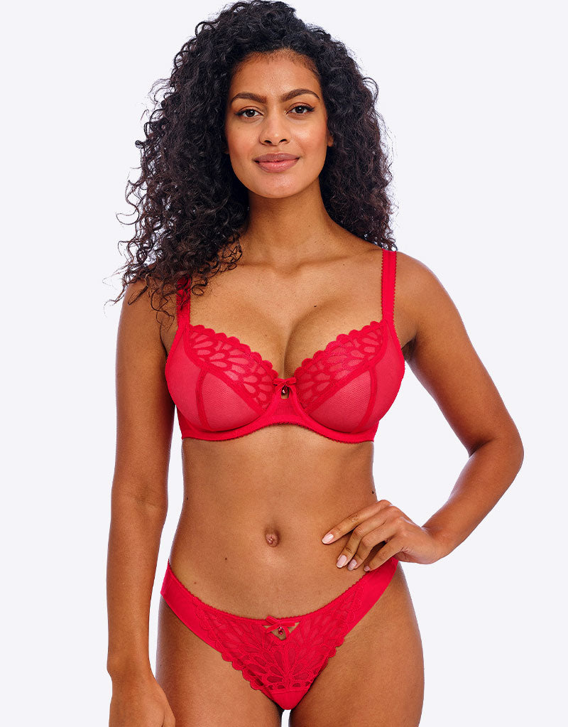 Freya's Loveland plunge bra turns up the heat in this Bombshell Chilli Red colourway. The soft, sheer mesh cups are sexy and modern, with a luxurious Art Deco inspired nd Swiss designed embroidery to decorate the top cup. A plunging neckline gives your bust a great shape and frames your cleavage, complete with gemstone charm and velvet bow to the centre front.
