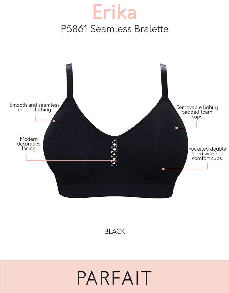 The Erika seamless bralette from Parfait is comfy and supportive, offering a smooth fit under clothes and against your skin. Double layered cups feature removable foam pads, while the microfibre back encases the underband elastic to add extra comfort. Finished with modern lacing detail to the front to keep it cute.