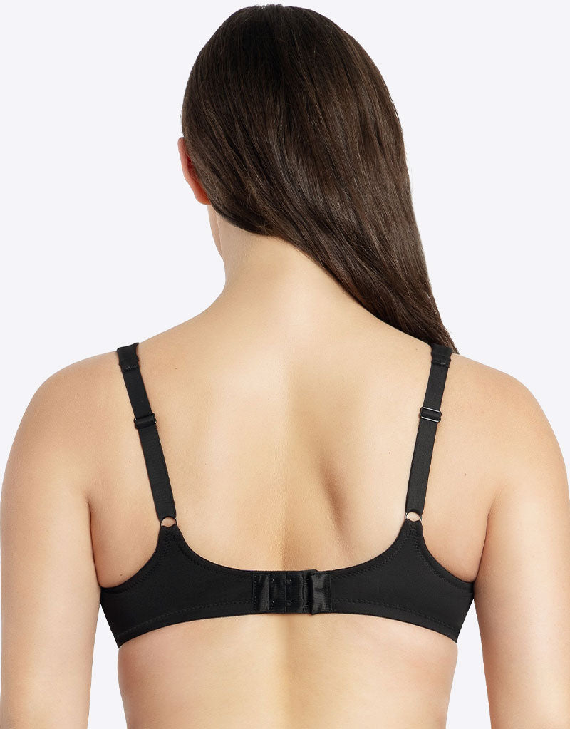 Parfait's Erika full cup t-shirt bra is perfect for everyday in classic black. Seamless cups offer a smooth shape under clothing, in a fuller coverage cut to give a secure fit and hold. Double layered, opaque fabric adds modesty while cushioned shoulder straps maintain comfort. Inner side slings shape your bust for a sleek, natural looking profile.