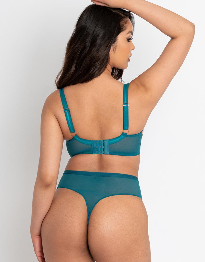 Scantilly's popular Sex Education set returns in a stunning teal colourway! Vertically seamed balcony cups lift and shape DD-HH cups to give incredible cleavage and a real 'cakes-on-a-plate' look, while the semi-sheer mesh teases and tantalises. Adorned with gorgeous embroidery of a curvy female figure, with satin trims and rose gold hardware to give a luxurious finish.